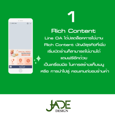 ถ้าเป็น Line ธรรมดา จะใช้งานได้ก็ต่อเมื่อเป็นบัญชีระดับสูงๆ ที่มียอดการสั่งซื้อเยอะๆ แต่ Line OA ได้ปลดล็อคการใช้งาน Rich Content บัญชีธุรกิจที่เพิ่งเริ่มเปิดร้านก็สามารถใช้งานได้ แถมฟรีอีกด้วย เป็นเครื่องมือ ในการสร้างแท็บเมนู หรือ การนำไปสู่ คอนเทนต์ของร้านค้า